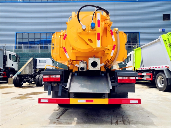 吸污部分:3.8方污罐,罐體5mmQ235優(yōu)質(zhì)碳鋼,配淄博SK-9水循環(huán)泵(北方地區(qū)可選裝真空油泵),8米吸污管一根,進(jìn)氣管加過(guò)濾網(wǎng),防溢閥加高,后蓋卡扣鎖緊,前視污亮管,后尾部加裝1個(gè)力拓牌**mm、150mm的球閥均帶進(jìn)出口,罐體帶舉升功能,后門(mén)帶液壓開(kāi)啟。